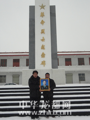 鄭春光的家人抱著其遺像在淮陽縣烈士陵園