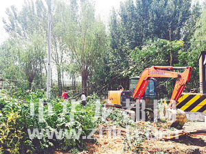 8月22日10時,記者在大慶路橋北西側(cè)的濱河路上看到,市園林處的工作人員在平整場地、清除雜草、移栽苗木。