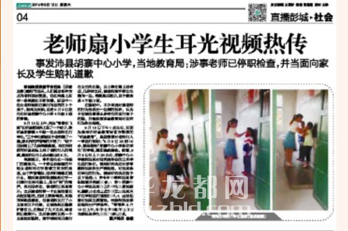 在等待調(diào)查結(jié)果的同時(shí),記者通過(guò)網(wǎng)絡(luò)積極尋找與該視頻相關(guān)的信息。9月12日17時(shí)許,記者在當(dāng)天的《彭城晚報(bào)》上看到一則標(biāo)題為《老師扇小學(xué)生耳光視頻熱傳》的消息,報(bào)紙上刊登的圖片為視頻中的截圖。據(jù)報(bào)道,該事件發(fā)生在江蘇省徐州市沛縣胡寨中心小學(xué)。9月9日7時(shí)30許,胡寨中心小學(xué)老師吳某對(duì)沒(méi)有完成作業(yè)的3名學(xué)生進(jìn)行體罰,后被人舉報(bào)。目前,涉事學(xué)校和老師已向家長(zhǎng)和學(xué)生賠禮道歉。