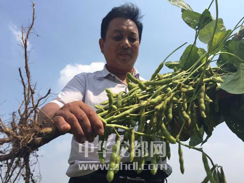 ??? 圖③ 9月25日,在西華縣逍遙鎮(zhèn)全國種糧大戶曹自堂的試驗(yàn)基地,曹自堂看著試種的大豆新品種喜出望外。記者 張猛 攝
