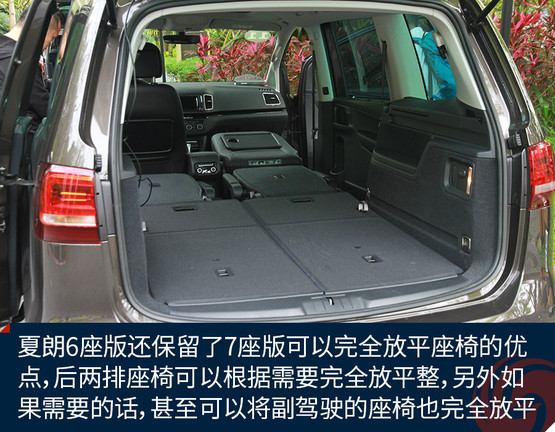同時(shí),夏朗6座版還保留了7座版可以完全放平座椅的優(yōu)點(diǎn),后兩排座椅可以根據(jù)需要完全放平整,只不過6座版在第二排中間會(huì)有個(gè)洞,不像7座版那么完美。另外如果需要的話,甚至可以將副駕駛的座椅也完全放平,將夏朗變成一款“商用車”。