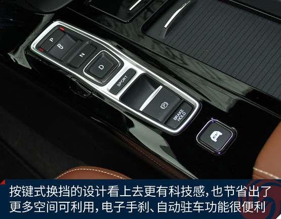 車內(nèi)采用了新的棕色真皮內(nèi)飾,而且還覺得缺了點(diǎn)什么。沒錯(cuò)!之前的排擋桿不見了,取而代之的是按鍵式換擋機(jī)構(gòu),看上去更有科技感,控制區(qū)也更簡(jiǎn)潔了。