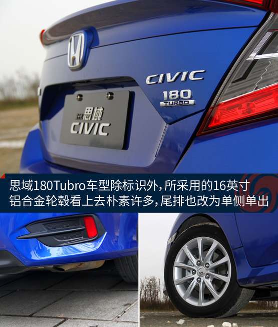 隨著思鉑睿混動(dòng)車型的推出,這次走入門路線的思域1.0T也來打了個(gè)醬油。跟之前的1.5T車型相比,外形基本保持一致。鑒于其更入門的定位,輪轂的樣式看起來沒那么精致和動(dòng)感了,尾排改為了單側(cè)單出的設(shè)計(jì),車尾的動(dòng)力標(biāo)識(shí)也有之前的“220TURBO”改為“180TURBO”。