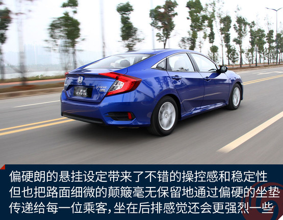 思域的定位一直偏向運(yùn)動(dòng),這一代車型自然不會(huì)放棄這一特色,底盤的扎實(shí)感、懸掛偏硬朗的設(shè)定都營(yíng)造了同級(jí)別里相對(duì)出色的操控感受。不過懸掛系統(tǒng)在韌性方面相對(duì)薄弱,路感太強(qiáng)烈,鋪裝路面上細(xì)微的不平整所帶來的振動(dòng)也比較清晰地傳遞到車內(nèi)。座椅的靠背包裹感還不錯(cuò),填充也比較得體,很舒服,但坐墊偏硬,因此行駛中車輛整體對(duì)振動(dòng)的抑制能力欠佳,很大程度上影響了舒適性。