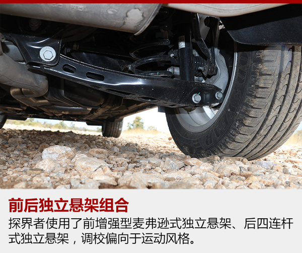 探界者的底盤受到雪佛蘭運(yùn)動傾向的影響,被調(diào)校的有些偏硬,這樣對于車身側(cè)傾的抑制就非常到位,面對路面上連續(xù)的起伏,緊致的懸架也帶來很強(qiáng)的整體感。但是當(dāng)面對較大的顛簸或者減速帶一類的時(shí)候,車身就會產(chǎn)生彈跳的感覺,而且懸架的回彈稍有延遲,總有一次小幅度的二次彈跳,稍稍影響了舒適性。