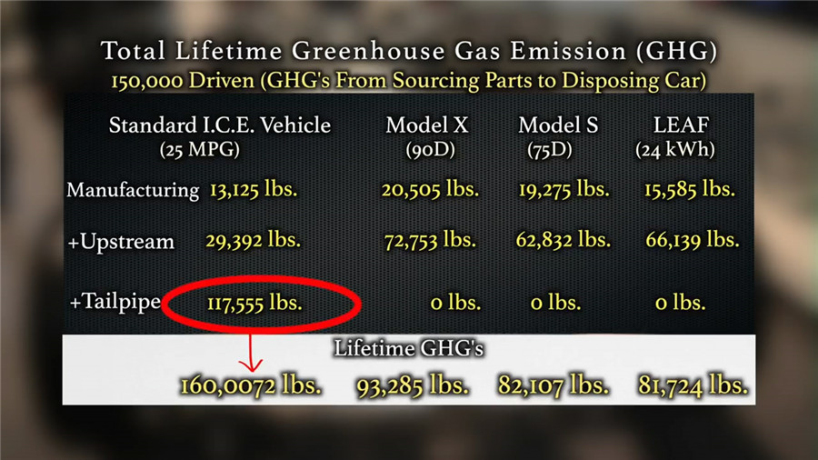 ????????這張表更加清晰,分別統(tǒng)計了普通內(nèi)燃機汽車(25MPG=百公里油耗9.4升)、特斯拉Model X 90D、Model S 75D和聆風(電池容量24kWh)在車輛生產(chǎn),燃油/電能生產(chǎn)過程以及駕駛使用過程中的排放,可以看到,盡管電動車在車輛生產(chǎn)、電能生產(chǎn)過程中產(chǎn)生的排放更高,但行駛工程中的零排放仍然使其在整個生命周期中的排放更低。