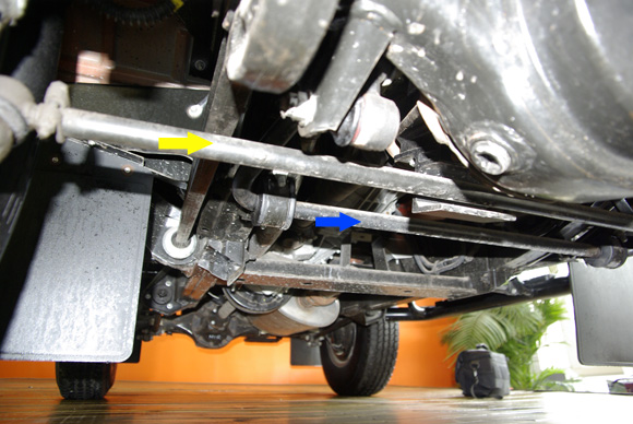 ????上圖中橙黃色箭頭為前軸的限位拉桿,不僅限制前軸自身發(fā)生扭轉(zhuǎn),也可對(duì)前軸的相對(duì)車架的前后位置進(jìn)行限制。藍(lán)色箭頭為前防傾桿,目測粗細(xì)并不算大,相信這也跟衛(wèi)士不看重公路性能有關(guān)。