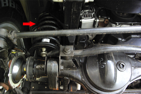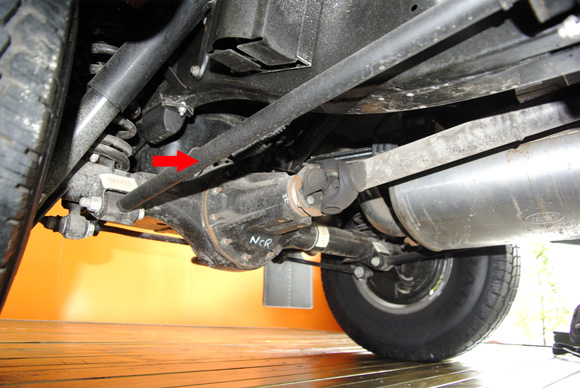 ????衛(wèi)士的后軸采用拖臂式后懸,紅色箭頭所指的拉桿就是拖臂。左右各一根,拖臂及避震機(jī)對(duì)后軸的自由度進(jìn)行控制,后軸相對(duì)車架的位置和自身的扭轉(zhuǎn)都得到了控制。