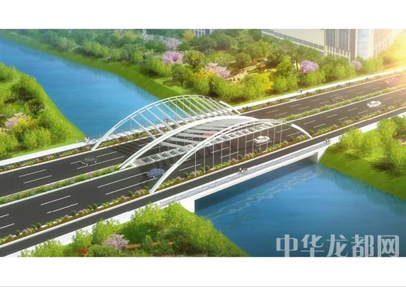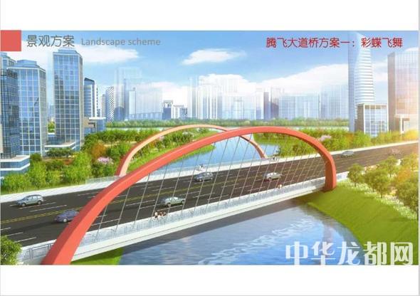 騰飛大道橋的設計方案有兩套,分別為“彩蝶飛舞”和“雙鳳呈祥”?!安实w舞”為下承式鋼管拱橋,寬36米。記者從效果圖中看到,橋兩側的拱圈,極具色彩感,給人一種賞心悅目的感覺。“雙鳳呈祥”為裝飾鋼管拱橋,寬36米。該橋采用“雙鳳”造型,象征天下太平,富含吉祥之意。