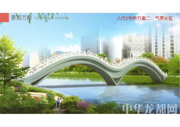 人行2號橋的設計方案有兩套,分別為“旭日東升”和“氣貫長虹”?!靶袢諙|升”為圓形塔懸索橋。記者從效果圖中看到,該橋的橋塔為圓形,猶如一輪東升的太陽,象征著城鄉(xiāng)一體化示范區(qū)蓬勃發(fā)展的未來?!皻庳為L虹”為中承式系桿拱橋。該方案結合中國玉帶橋的古典元素、抽象古典幾何美學,采用現(xiàn)代的設計手法,創(chuàng)作出現(xiàn)代感和中國傳統(tǒng)橋梁元素雜糅的橋梁設計。
