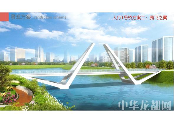 人行1號橋的設計方案有兩套,分別為“飛龍在天”和“騰飛之翼”。“飛龍在天”為雙塔斜拉橋。記者從效果圖中看到,該橋呈現(xiàn)出優(yōu)美的線條,宛如一條長龍騰空在天。“騰飛之翼”為V腿連續(xù)鋼箱梁橋。記者從效果圖中看到,橋體簡潔流暢,時尚現(xiàn)代,橋墩形成穩(wěn)固的三角形,像兩只燕子展翅高飛。