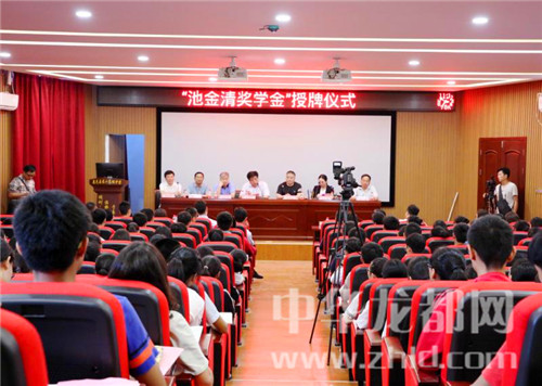 中華龍都網(wǎng)訊(周口報(bào)業(yè)全媒體記者李瑞才 通訊員 郭中華 寧高明)致富不忘桑梓,設(shè)獎(jiǎng)回饋母校……5月18日下午,“池金清獎(jiǎng)學(xué)金”授牌儀式在鹿邑二高舉行。鹿邑縣金輝名酒貨倉(cāng)董事長(zhǎng)池金清、鹿邑縣教體局局長(zhǎng)王振言及全校師生代表300多人參加授牌儀式,以對(duì)從該校走出去、創(chuàng)業(yè)有成并設(shè)立獎(jiǎng)學(xué)金回饋母校學(xué)子的池金清先生的義舉表示感謝。