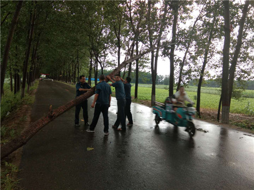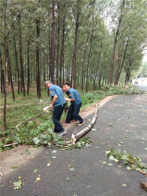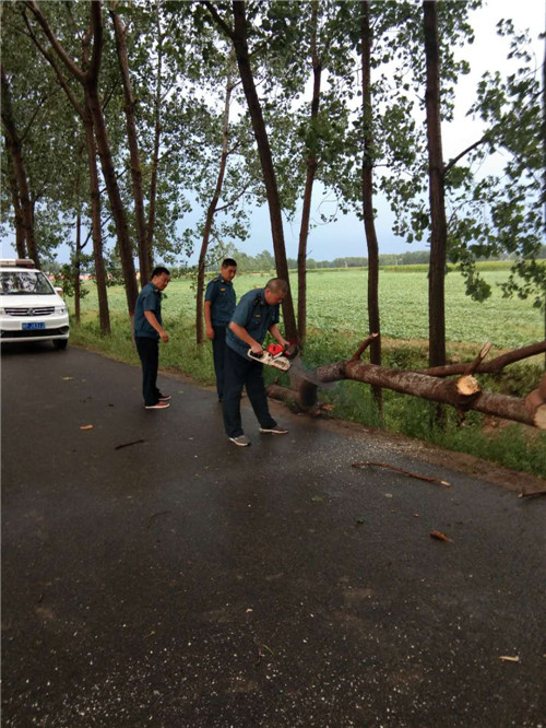 在東夏看張立交橋、李莊橋處,多棵行道樹(shù)被大風(fēng)刮倒,大量枝掉落在公路上,嚴(yán)重危及行車(chē)安全和道路通行,執(zhí)法人員立即冒雨采取安全防護(hù)措施,并利用車(chē)載應(yīng)急搶險(xiǎn)工具將倒塌在公路上直徑為10-20cm的樹(shù)木進(jìn)行及時(shí)清理,并對(duì)殘枝落葉進(jìn)行了全面清掃。歷時(shí)三個(gè)小時(shí),及時(shí)地消除了道路安全隱患,保障人民群眾的出行安全。