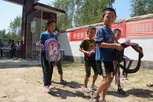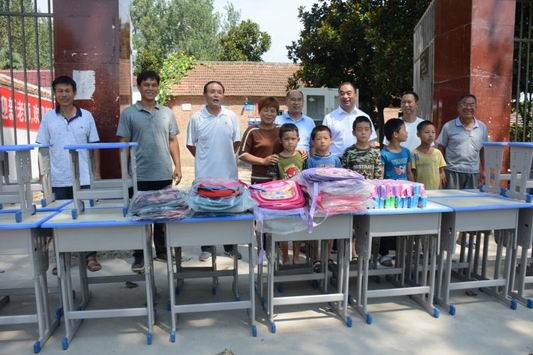 8月27日上午11時許,商水縣平店鄉(xiāng)大朱莊村小學大 門外,突然停放一輛廂式貨車??吹接袉挝凰蛠砹恕伴_學禮”,學校老師和學生滿臉興奮 、七手八腳和來人一塊卸下一些嶄新的課桌凳、書包文具等學習辦公用品。