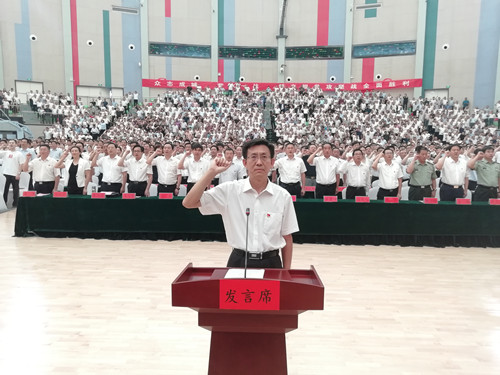 “不忘初心、牢記使命………爭(zhēng)分奪秒、苦干實(shí)干,堅(jiān)決打贏脫貧攻堅(jiān)戰(zhàn)!”隨著縣委書記馬明超領(lǐng)誓,與會(huì)的約4000名干部集體莊嚴(yán)宣誓??h委副書記、縣長(zhǎng)王毅主持大會(huì)。