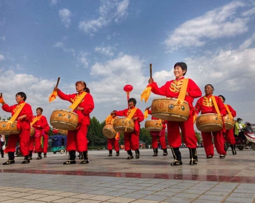 廣場上,一排排碩大的紅氫氣球高懸,氣球下縣掛著祝賀農(nóng)民豐收節(jié)的標語。穿著各種鮮艷顏色的表演服裝的民間藝術表演隊,給節(jié)日增光添彩,擂響盤鼓,為節(jié)日助威。從全縣23個鄉(xiāng)鎮(zhèn)起早趕來的46支民間藝術表演隊伍,伴隨著悠揚的音樂,喧天的鑼鼓在廣場上各顯其能。腰鼓、盤鼓、耍獅子、劃旱船、抬花轎、挑花籃、廣場舞也以不同的方式表達著豐收的喜悅。