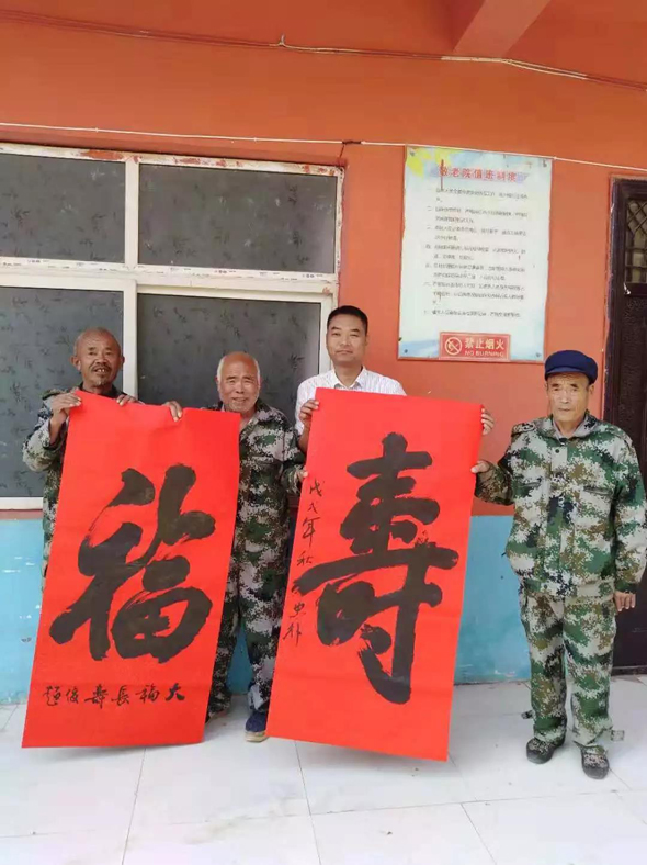 鄲城縣衛(wèi)計(jì)委駐虎崗鄉(xiāng)虎崗行政村第一書(shū)記王忠樸,是鄲城縣書(shū)法協(xié)會(huì)副主席兼秘書(shū)長(zhǎng),在他的牽線下,鄲城縣書(shū)法協(xié)會(huì)主席巴云山帶領(lǐng)10多名書(shū)法協(xié)會(huì)會(huì)員前來(lái)助陣,與敬老院里懂書(shū)法的老人一起揮毫潑墨。