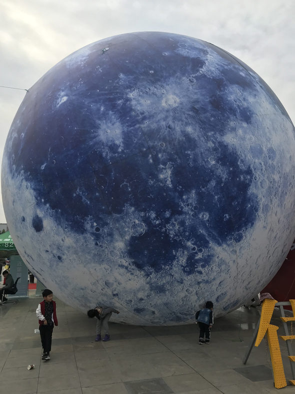 記者在現(xiàn)場看到,這個“大月亮”塊頭很大,擺放在展廳前。前來參加展會的市民紛紛拍照,有的市民還把它發(fā)到微信朋友圈,稱“周口有個超級大月球”。