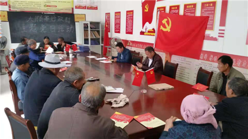 “我志愿加入中國共產(chǎn)黨,擁護(hù)黨的綱領(lǐng),遵守黨的章程,履行黨員義務(wù)……”在汲水鄉(xiāng)張嶺行政村室,汲水鄉(xiāng)黨委副書記王申帶領(lǐng)全體黨員面對(duì)黨旗,一起重溫入黨誓詞,并學(xué)習(xí)黨章黨規(guī)。