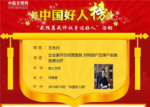 太康縣農(nóng)家出身的王永興熱心公益,累計投資高達數(shù)千萬元。10月31日上午,10月中國好人榜發(fā)布儀式暨全國道德模范與身邊好人現(xiàn)場交流活動在江蘇連云港舉行,太康縣王永興榮登10月份助人為樂類“中國好人榜”。據(jù)悉,太康縣入選“中國好人榜”人數(shù)已達42人。