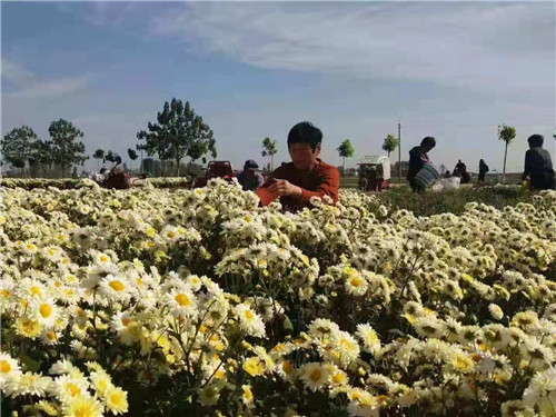 當(dāng)日,位于高集鄉(xiāng)北部的黨橋、雙堂等幾個行政村,也是熱鬧非凡。一臺臺大小不同的車輛,滿載著剛從地里摘下的鮮菊花,正往富甲一方菊花加工廠里銷售,縷縷的菊花清香隨風(fēng)飄來,煞是誘人。在富甲一方合作社帶動下,今年有16戶貧困戶種植80多畝菊花,鄉(xiāng)政府對首次種植的貧困戶負(fù)責(zé)技術(shù)培訓(xùn),并給予每畝1000元的生產(chǎn)獎補(bǔ)。今年菊花每公斤4元左右,麥茬種植菊花每畝可產(chǎn)鮮菊1100-1300公斤,去掉雇人摘菊花費(fèi)用每公斤0.3元,每畝可收入4000-5000元。種植菊花的貧困戶孫建國在富甲一方收購現(xiàn)場,正樂呵呵的數(shù)著賣菊花得來的大把鈔票。