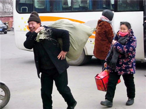 男男女女老老少少,帶著大包小包的年貨,急切而快樂地回家過年。