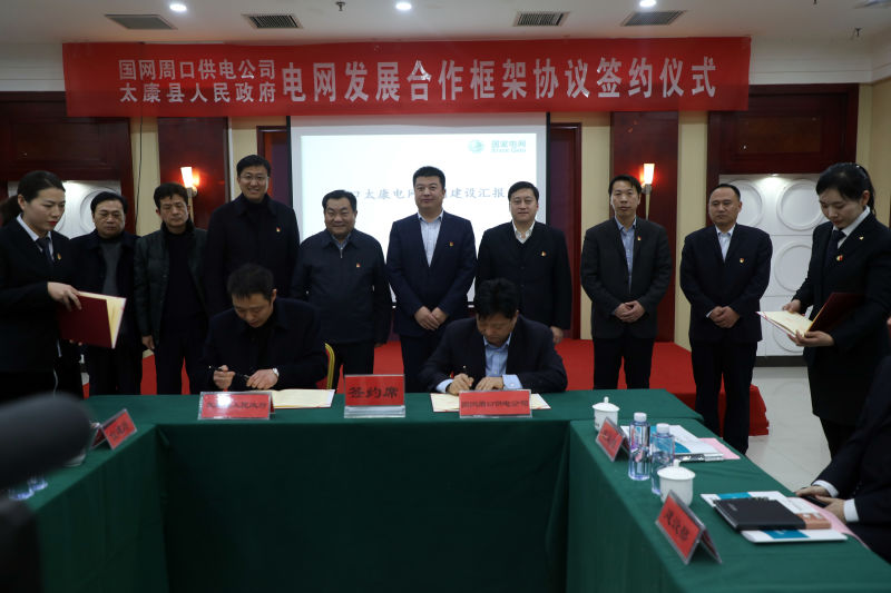 2月13日,太康縣人民政府與周口市供電公司舉行電網(wǎng)發(fā)展合作框架協(xié)議簽約儀式。周口市供電公司總經(jīng)理郭雷、副總經(jīng)理靳玉林,紀(jì)委書記、工會主席張浩,太康縣領(lǐng)導(dǎo)王國璽、董鴻、喬偉等出席簽約儀式??h委常委、縣委辦公室主任董鴻主持簽約儀式。