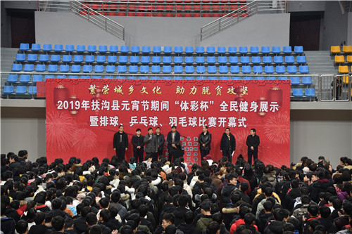 2月17日上午,元宵佳節(jié)即將來臨之際,在全縣脫貧攻堅沖刺的關(guān)鍵時期,扶溝縣2019年元宵節(jié)“體彩杯”全民健身展示暨排球、乒乓球、羽毛球比賽活動在縣體育館隆重開幕?;顒又荚谪S富全縣廣大人民群眾的文化生活,助力脫貧攻堅,為實現(xiàn)“五個扶溝”增光添彩??h委常委、宣傳部長馬昭才,副縣長吳興華等出席開幕式??h委宣傳部副部長張根主持開幕式。
