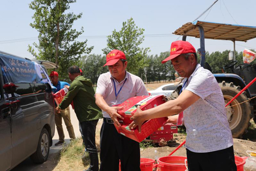 6月4日中午,太康縣委宣傳部常務副部長趙勇與瀘州老窖(懷舊)公司豫南區(qū)負責人劉光軒等工作人員一起,在王集鄉(xiāng)慰問后又不顧炎熱來到了馬廠鎮(zhèn)麥收一線,給工作人員送去礦泉水、粽子、牛奶等用品。