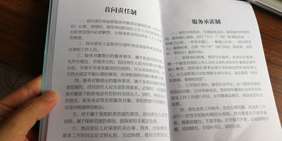 制度規(guī)定,服務(wù)對(duì)象到縣委組織部辦事、咨詢或來(lái)電時(shí),首個(gè)接待的工作人員必須熱情、禮貌、耐心接待辦理或引領(lǐng)交給相關(guān)職責(zé)科室辦理。凡符合規(guī)定,手續(xù)齊全的,限時(shí)辦結(jié),手續(xù)不全未能及時(shí)辦結(jié)的,要主動(dòng)向服務(wù)對(duì)象說(shuō)明原因……縣委組織部常務(wù)副部長(zhǎng)薛斌告訴記者:“通過(guò)扎牢制度的籠子,讓部機(jī)關(guān)工作人員做到一張笑臉迎客,一把椅子讓座,一杯茶水暖心,一顆誠(chéng)心辦事,一流業(yè)績(jī)爭(zhēng)先的服務(wù)標(biāo)準(zhǔn),切實(shí)達(dá)到門(mén)好進(jìn)、臉好看、話好聽(tīng),事好辦的目的?!?/p>