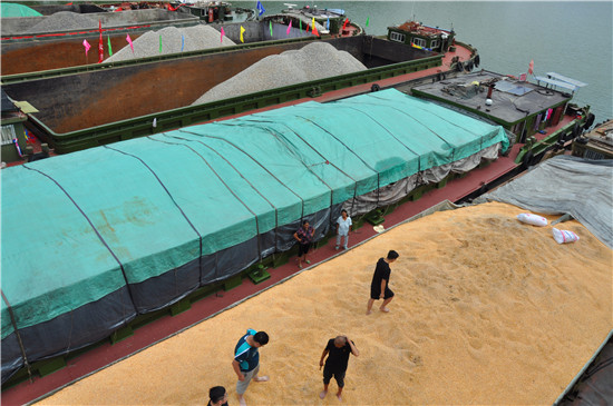 8月8日上午,在碧波蕩漾的商水港區(qū),6條載重上千噸的大船緊靠在一起,一船金燦燦的玉米,兩船褐色的石子,三船白色晶體方解石。站在港口上方遠(yuǎn)遠(yuǎn)望去,6條貨船像一塊彩條布鑲嵌在綠色的河面上。
