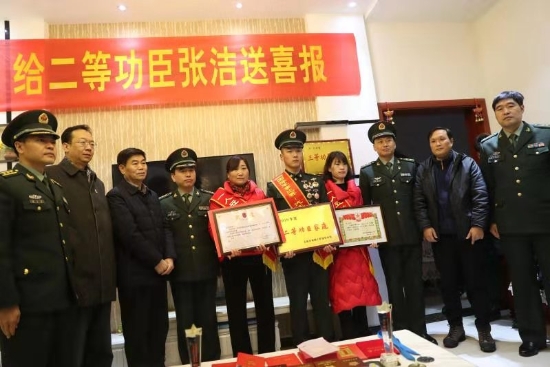 當(dāng)日上午,張潔的老家鑼鼓喧天,熱鬧非常。軍地領(lǐng)導(dǎo)在鄉(xiāng)親們熱烈地掌聲和鑼鼓聲中,帶著滿滿地祝福,專程趕到張潔家中。“張潔同志,在國際軍事比武競賽中取得第一名,榮立二等功為此特向您報(bào)喜。希望您今后多與部隊(duì)聯(lián)系,多給予張潔同志鼓勵(lì),為實(shí)現(xiàn)中華民族偉大復(fù)興的強(qiáng)國夢、強(qiáng)軍夢共同奮斗?!痹趶垵嵓抑校?9246部隊(duì)副政委楊富鵬代表組織宣讀了部隊(duì)賀信。