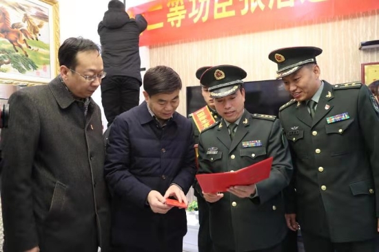 隨后,周口軍分區(qū)政治部主任李揚(yáng),太康縣委副書記、政法委書記劉海艇,縣委常委、副縣長韓維俊,縣委常委、人武部部長于永前,人武部政委郭立君等領(lǐng)導(dǎo)給張潔的母親盧靈芝送去了立功喜報(bào)、二等功臣家庭牌匾和慰問品、慰問金。