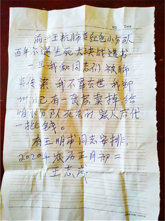 初二晚上,他是邊哭邊寫下遺書。他說,病毒傳染,看不見摸不著,也不知道誰攜帶?更不知道明天大家是個什么情況,既然動員大家沖到抗疫一線,戰(zhàn)死了,他的家人咋辦?他說,他在鄭州有一處房產(chǎn)是養(yǎng)老用的,他害怕自己不幸感染去世了,沒人照顧小分隊戰(zhàn)死的家人生活,隨寫下遺書,如果出現(xiàn)這種情況,將他的房產(chǎn)賣掉,分給抗疫戰(zhàn)死的隊員家人。