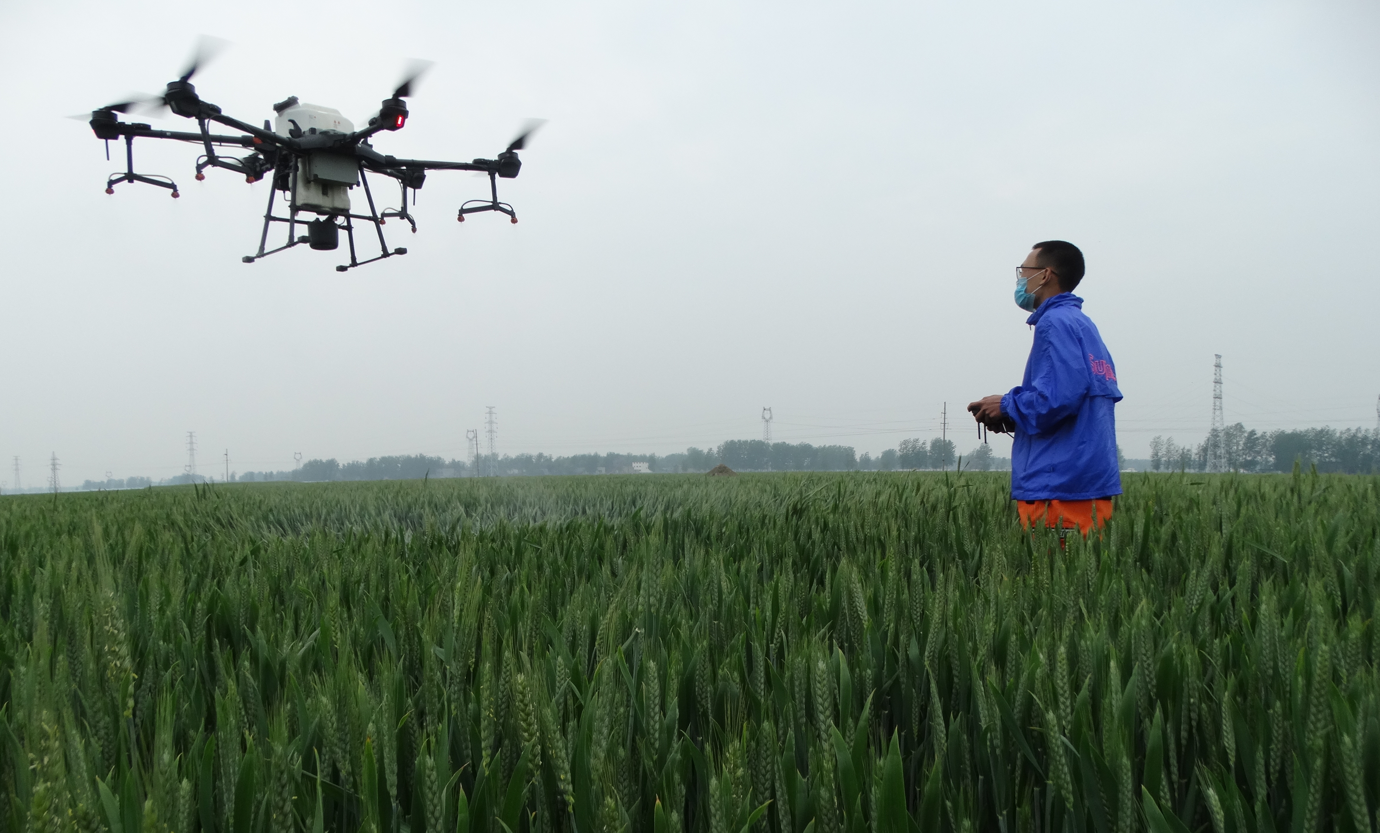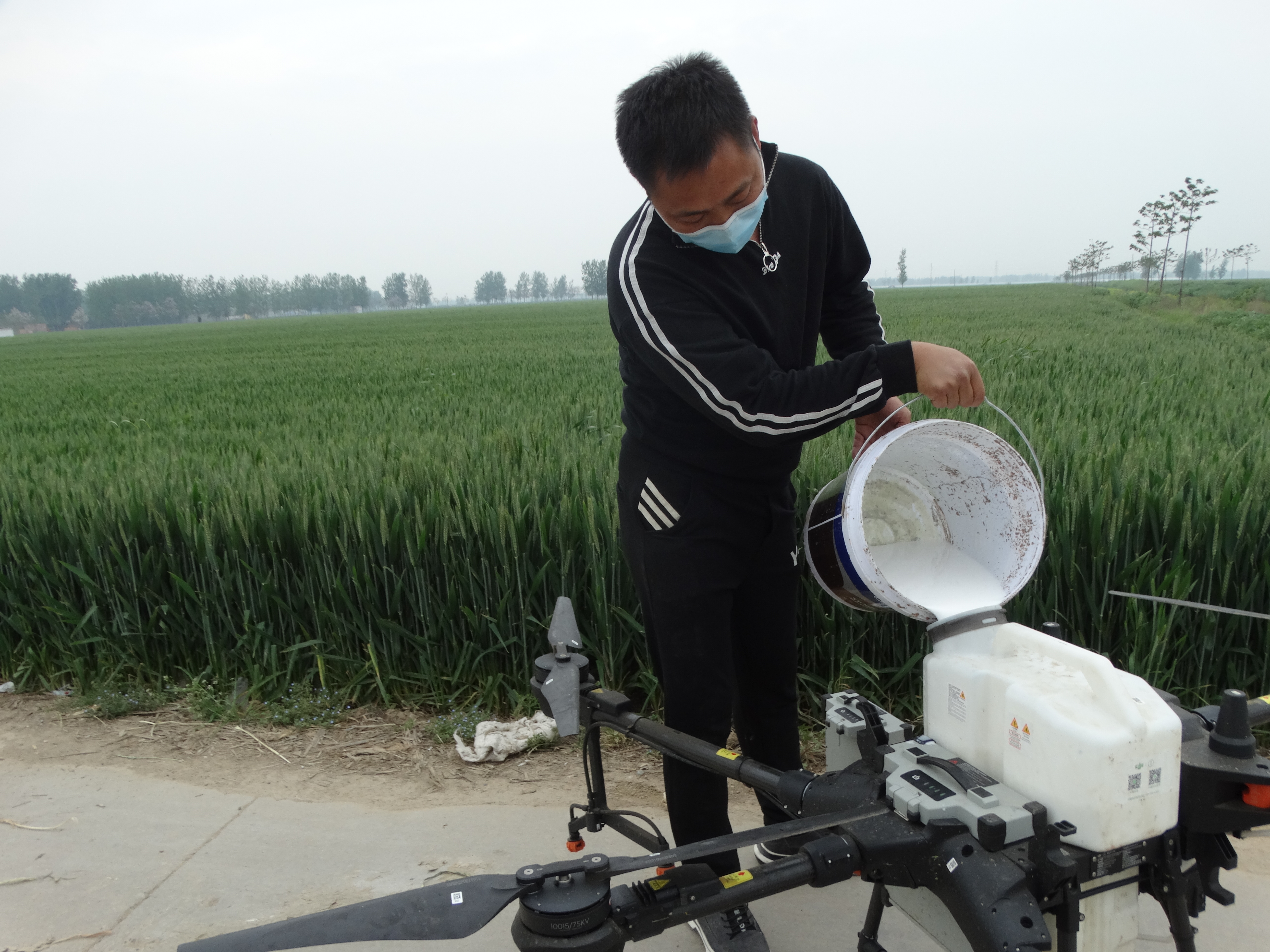 4月18日,沈丘縣周營鎮(zhèn)王寨村小麥高產(chǎn)示范基地,飛防技術(shù)人員在操作無人機進行“一噴多防”作業(yè),噴施“防治病蟲害+強筋壯骨增產(chǎn)營養(yǎng)液”套餐。