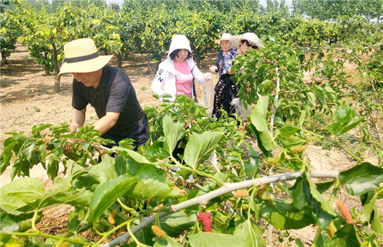 眼下正是桑葚陸續(xù)成熱的好時(shí)節(jié)。黃泛區(qū)農(nóng)場(chǎng)郭莊村鷹虎寶百畝桑椹園,一排排桑樹(shù)枝頭上,掛滿(mǎn)了或青或紅或紫的桑葚。紫黑桑葚放入口中,輕輕一咬,甜甜酸酸的味道瞬間在口中蔓延開(kāi)來(lái),讓人忍不住想多嘗幾顆。