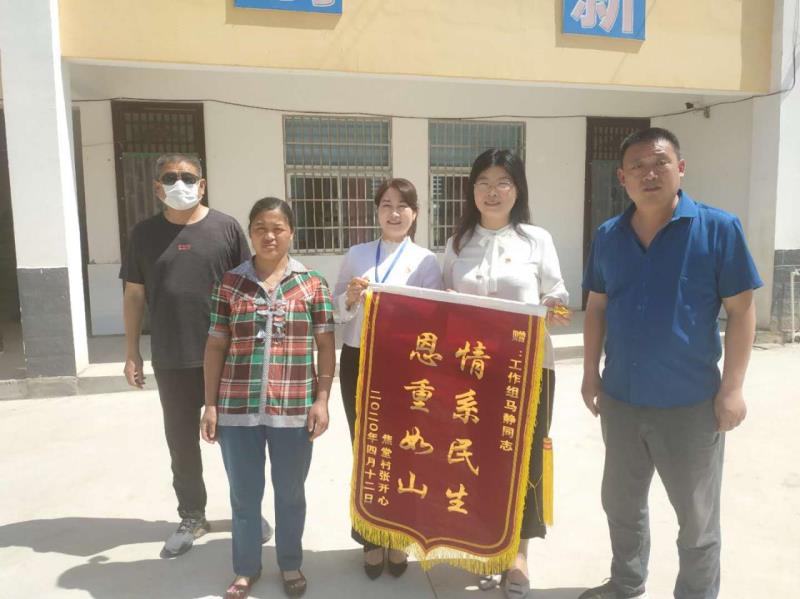 5月19日,太康縣王集鄉(xiāng)焦堂行政村張草帽自然村村民萬(wàn)勤霞來(lái)到焦堂村小學(xué),將一面繡有“情系民生 恩重如山”的錦旗送到了該縣紀(jì)委常委、監(jiān)委委員馬靜,工作組成員王向花、馬景華、張海亮手中,感動(dòng)的淚水忍不住地流。