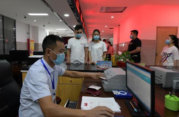“你就是因為疫情防控推遲婚禮的那個警察吧!”5月20日上午,在鹿邑縣民政局婚姻登記大廳,工作人員看了身份證件后立即認(rèn)出了他們,專門為他們開通了“綠色通道”;同事們一起在執(zhí)勤的崗?fù)げ贾昧讼矚庋笱蟮摹霸苹槎Y”場地,與他們一起分享幸福的喜悅。