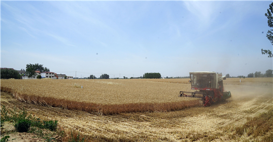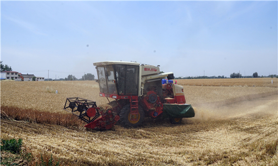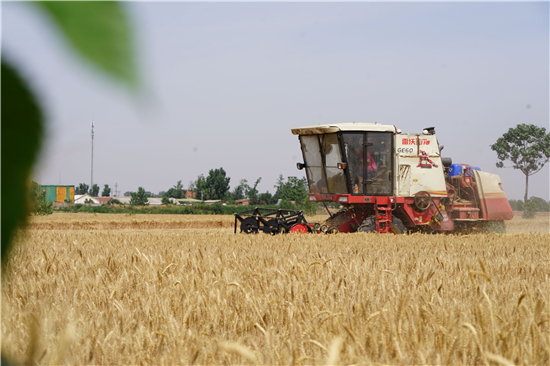 5月28日,在周口市西華縣遲營鄉(xiāng)前喜村,農民駕駛收割機在田間收割小麥。 眼下,周口市近千萬畝小麥陸續(xù)開鐮收割,當?shù)剞r民搶抓農時收割小麥,確保顆粒歸倉。 記者 金月全 攝
