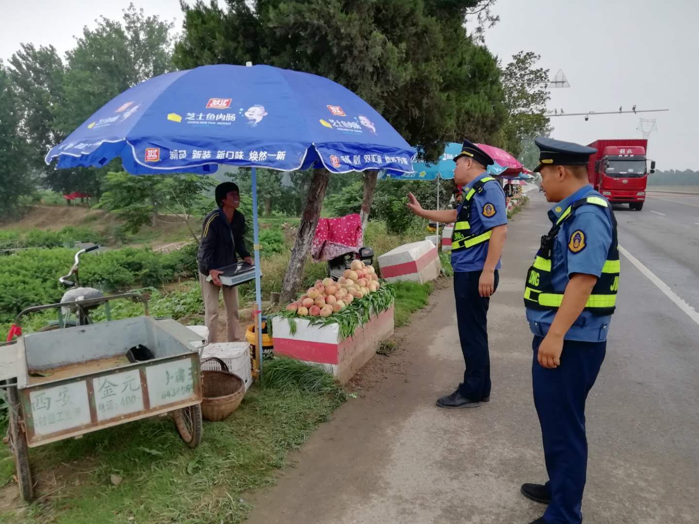 隨著瓜果等農產品陸續(xù)上市,龍源路附近很多村民直接把瓜果堆放在公路邊上占道經(jīng)營,給道路交通帶來嚴重的安全隱患。通過勸導、宣傳教育,提高了沿線經(jīng)營戶對違章占用公路擺攤設點危害性的認識,自覺將攤點撤離公路至安全地帶,確保了沿線公路的安全暢通。