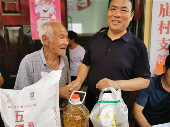 發(fā)放儀式開始后,村干部負(fù)責(zé)發(fā)放,老人們有序領(lǐng)取,個(gè)個(gè)興高采烈,歡笑聲響徹在邵廟村的上空……