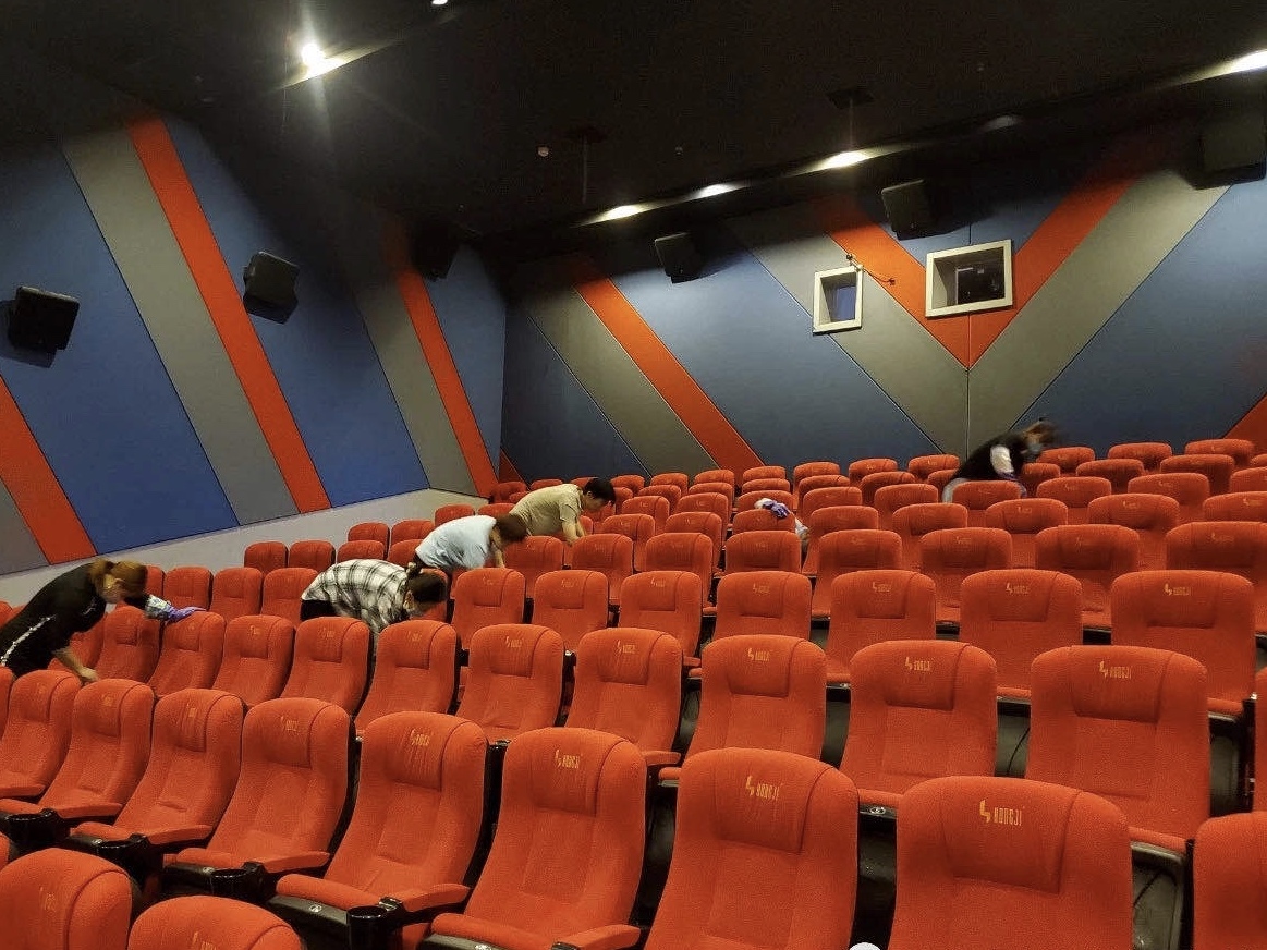 “停業(yè)六個(gè)月,終于等來(lái)了即將開(kāi)門(mén)的喜訊?!苯ㄐ侣芬患矣俺枪ぷ魅藛T說(shuō)。由于防疫需要,自1月24日以來(lái),一直處于停業(yè)狀態(tài)。7月20日上午,記者來(lái)到影院看到工作人員正在對(duì)觀(guān)影設(shè)備進(jìn)行檢測(cè)、調(diào)試,并對(duì)影廳、公共區(qū)域等處進(jìn)行深度防潮防霉、消毒工作,以安全整潔的環(huán)境迎接影院重開(kāi)。