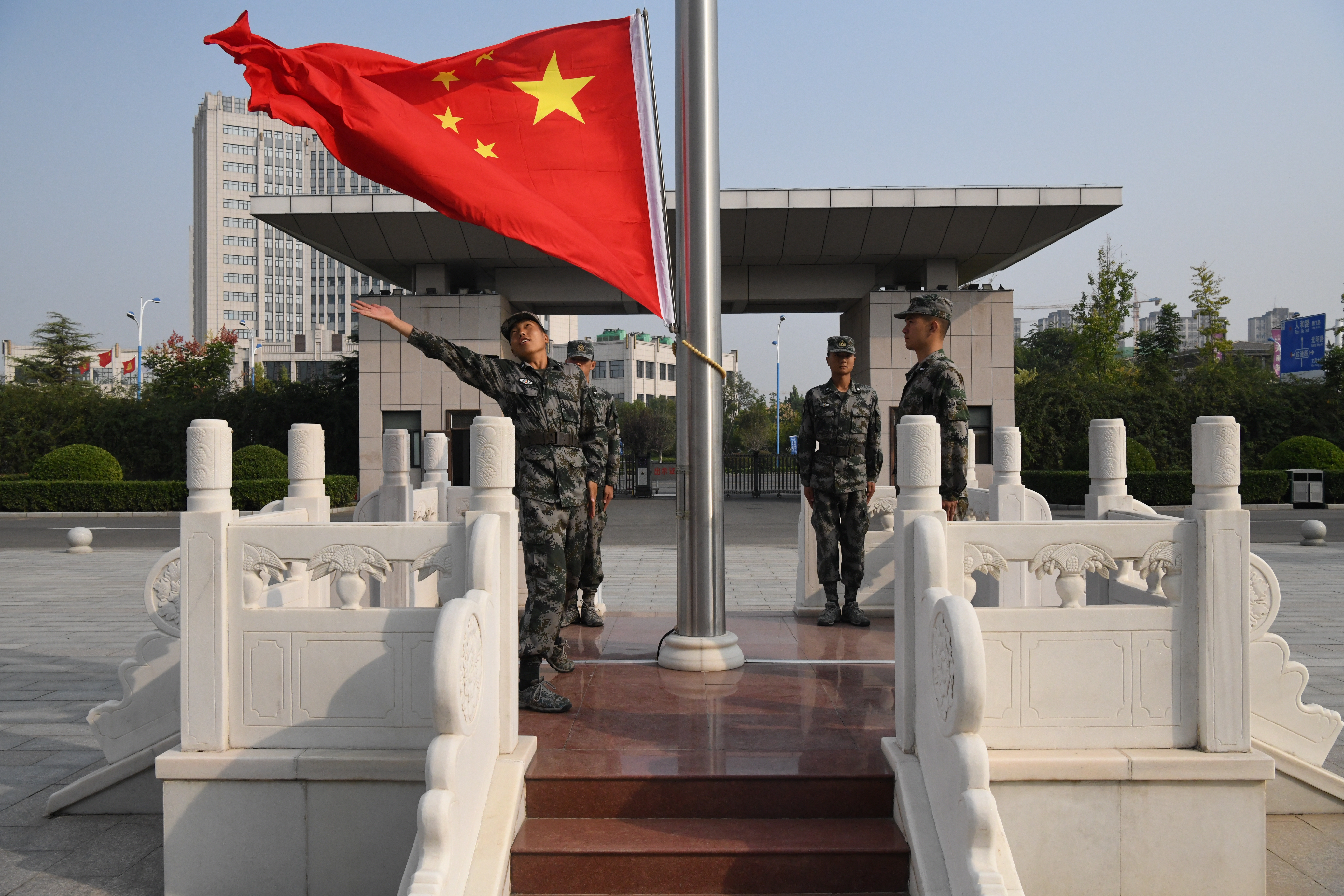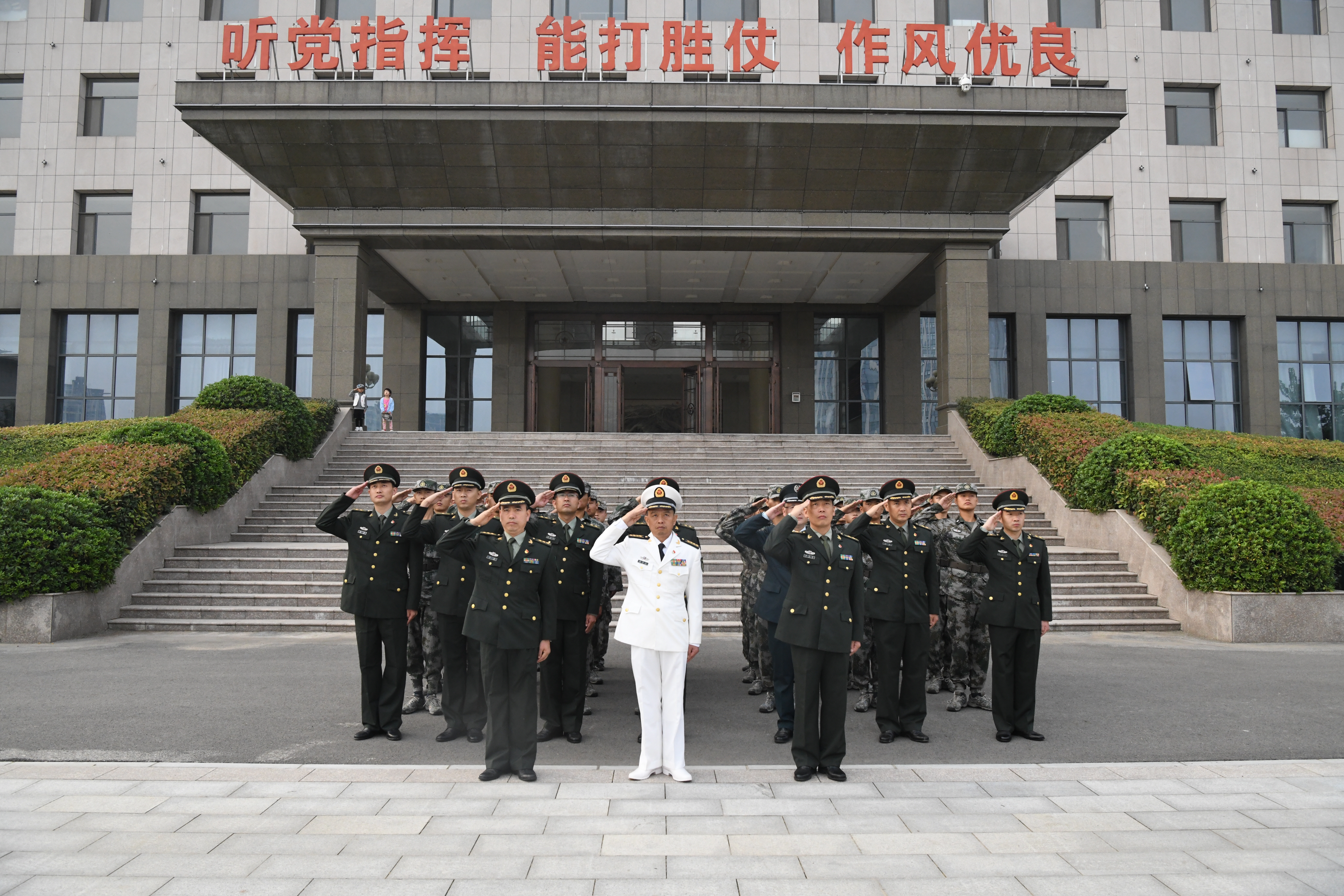 國旗飄揚(yáng)激發(fā)革命斗志,軍歌嘹亮詮釋忠誠誓言。10月1日上午,周口軍分區(qū)舉行升國旗儀式慶祝中華人民共和國71周年華誕。來自周口軍分區(qū)機(jī)關(guān)、市民兵武器裝備倉庫的全體官兵職工、文職人員80人參加了儀式。周口軍分區(qū)司令員湯維政主持儀式。當(dāng)日8時許,全體官兵在軍分區(qū)機(jī)關(guān)營區(qū)升旗臺前整齊列隊(duì),精神飽滿,士氣昂揚(yáng),帶著對祖國最熱忱的祝福,帶著對生活最美好的憧憬,等待著最莊嚴(yán)時刻的到來。隨著一聲“迎國旗”的洪亮口令,英姿颯爽的4名護(hù)旗手邁著鏗鏘有力的步伐護(hù)送國旗走向升旗臺。伴隨著雄壯的《義勇軍進(jìn)行曲》,升旗手抬手振臂,鮮艷的五星紅旗迎風(fēng)展開,在官兵們的注目下冉冉升起。