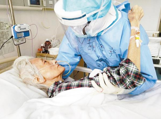 在武漢醫(yī)院,今年84歲的楊守振不僅感染新冠肺炎,而且有嚴(yán)重的營(yíng)養(yǎng)不良,插著胃管,身體極為消瘦,生活不能自理。為了不讓老人出現(xiàn)壓瘡,胡奔奔需要每隔一個(gè)小時(shí)為老人翻一次身。翻身時(shí)候,為了讓老人更舒服一點(diǎn),她每次都像抱孩子一樣把老人抱在懷里,動(dòng)作輕柔地按摩老人受壓的部位,防止壓瘡的形成。