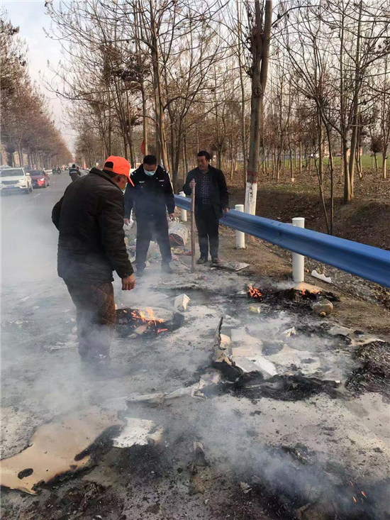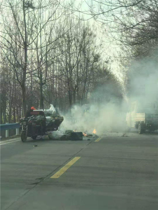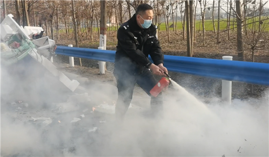 當日下午4點左右,太康縣交警大隊二中隊指導員南應開及輔警郭旗全、魯迪、尹晨豪正在趙堂村附近巡邏時,猛然看到前方一輛電動三輪車上有煙氣冒出,巡邏民警加速趕到。原來是一名老漢的一輛拉著廢舊紙箱的電動三輪車著了火,一車廢紙和塑料瓶散落一地正在燃燒,火越燒越旺,只見老漢正在手忙腳亂地滅火。這輛三輪車上拉的全是廢塑料、硬紙殼等易燃物,而且當時正刮著風,如果不及時滅火任由火勢蔓延,后果將不堪設想。看到此情況后,南應開迅速從警車上拿出滅火器秒變“消防員”,對著起火的物品進行滅火操作,同時安排輔警對過往行人和車輛進行疏導。由于發(fā)現和撲救及時,在民警的緊急救援下,火源很快被眾人合力撲滅。對太康交警面對火情臨危不亂、果斷處置、幫助群眾的行為,老漢車主和過往群眾紛紛點贊。②6