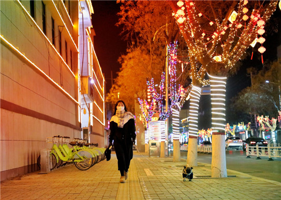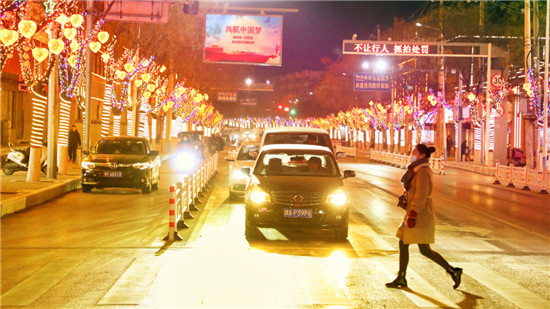 1月7日晚,扶溝縣城桐丘路,放眼望去,整條街道裝飾得色彩繽斕,形式各異的燈飾流光溢彩,美不勝收。景觀樹搖身一變,成了五彩繽紛的“星星樹”,一串串紅燈籠高高掛起,一顆顆“中國心”錯落有致,格外引人注目,引得路過的市民紛紛駐足拍照留念。
