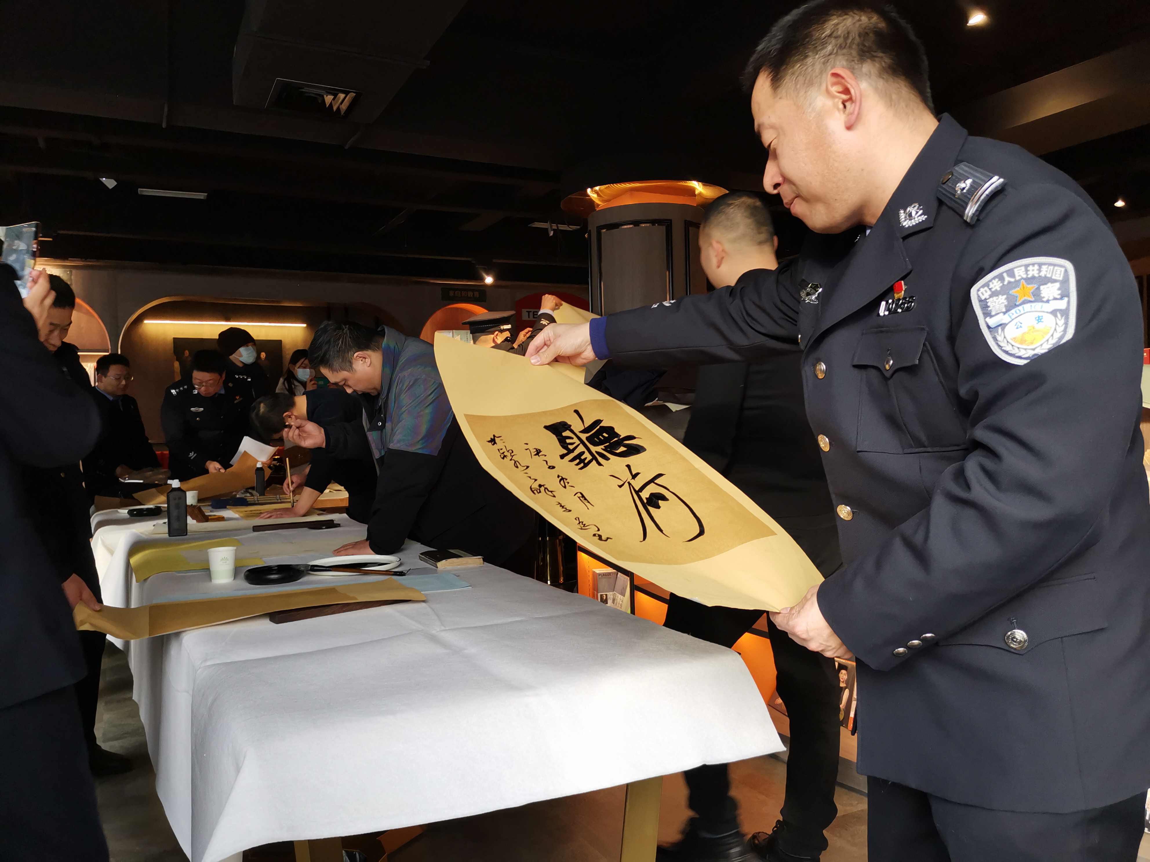 活動現(xiàn)場,氣氛熱烈,書法家們現(xiàn)場揮毫潑墨、筆走龍蛇,帶著喜迎牛年的美好祝愿。民警、輔警爭相圍觀,觀看、揣摩書法家們蒼勁有力的書法作品,房間內(nèi)洋溢著濃郁的節(jié)日氣息。
