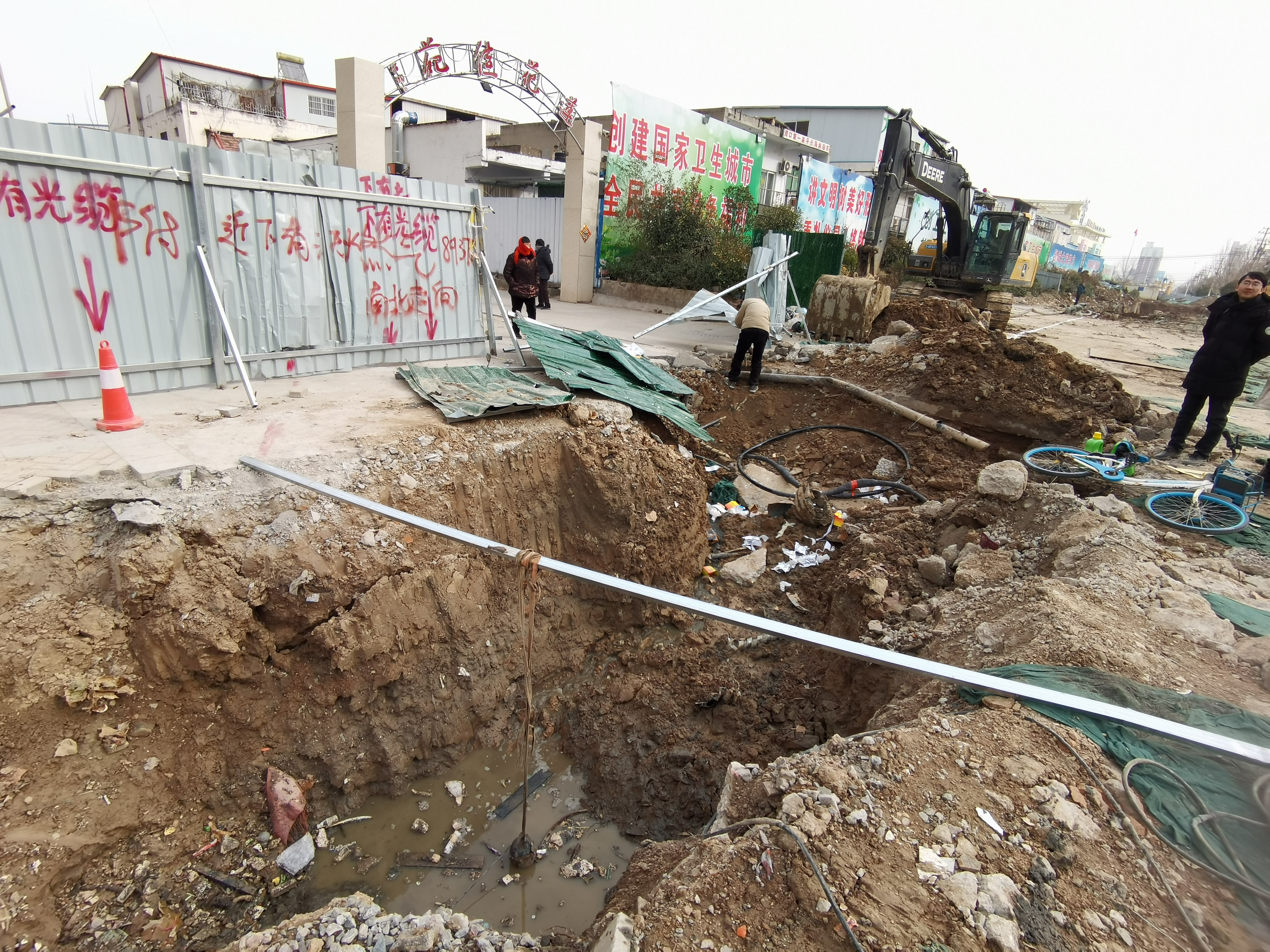 當日上午,在蓮花路中段蓮花佳苑小區(qū)門前的地下電纜外破現(xiàn)場,一輛挖掘機停在 外破點的旁邊,挖斷的電纜經(jīng)過搶修后裸露在一旁。現(xiàn)場施工人員介紹,此處正在進行箱涵施工,預計春節(jié)前能夠完工。