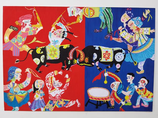2020年4月,錢玉燕無意中看到“決勝全面小康”第二屆全國農(nóng)民畫展覽征稿啟事,對農(nóng)村生活非常熟悉的她決定一試。她立足于周口平原農(nóng)區(qū)的特色,深深領(lǐng)悟周口幾千年來的農(nóng)耕文化,對參賽作品進(jìn)行了認(rèn)真、系統(tǒng)地構(gòu)思,最終決定以歡慶豐收的斗?;顒訛轭}材,把農(nóng)耕文化的深遠(yuǎn)、厚重與豐富的藝術(shù)表現(xiàn)手法相融合。她采用普通的繪畫卡紙,運用多種繪畫顏料,充分借鑒漢畫藝術(shù),吸收中原地區(qū)的剪紙文化、西方藝術(shù)大師畢加索立體畫派的藝術(shù)風(fēng)格和古埃及畫的靈感,以艷麗的紅、藍(lán)為主背景,采取夸張的表現(xiàn)手法,把斗牛的場景表現(xiàn)得淋漓盡致。作品創(chuàng)作發(fā)揮了豐富的想象力,人物動物造型借鑒中國民間藝術(shù)剪紙的方式表現(xiàn),以大膽、夸張、強(qiáng)烈的色彩搭配,把無限深廣的空間“壓扁”到一個平面上。