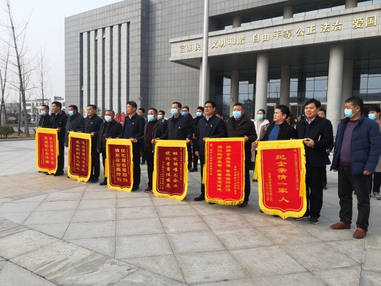 2月4日下午,淮陽區(qū)康森木業(yè)有限公司、周口裕彩科技研發(fā)有限公司等6家企業(yè)代表為區(qū)優(yōu)化營商環(huán)境專項治理工作組送來了6面錦旗和大量防疫物資,向工作組表達感激之情,對工作組人員高效快捷的工作給予高度贊揚。